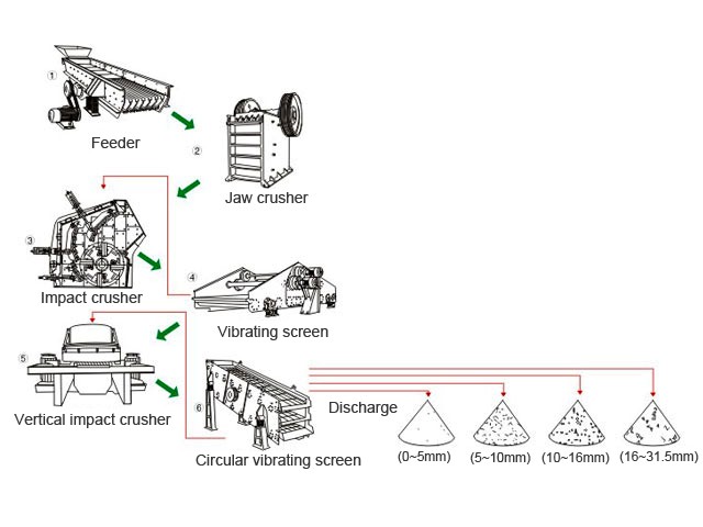 First, the raw materials are regularly conveyed into the elementary-crushing machine by the vibrating feeder, and then the belt conveyor transfers the elementary products to impact crusher for secondary crushing. The secondary products will be separated into stone of different sizes by the vibrating screen. The parts not satisfying the needs will be returned to the impact crusher for further crush.